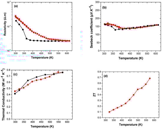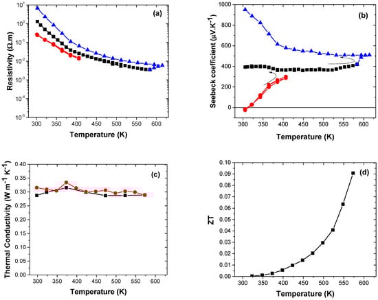 The Seebeck coefficient, which reflects the character of native dopants (defects, impurities, etc.), increases due to heating from the originally compensated value close to zero at 300 K up to 509 µV·K−1 at 600 K, as depicted in Figure 6b. Here, for the sake of clarity, we distinguished the behavior between 300 and 400 K (red circles), not influenced by temperature cycling, characterized by somewhat lower resistivity and the presence of n- and p-type carriers with a temperature-induced dominance of holes. When the temperature was increased to 500 K and reduced to 300 K, reproducible behavior with hole-like conductivity was observed (black squares). Here, let us note that Wei et al. obtained a higher value of the Seebeck coefficient (540 µV·K−1 at room temperature) for synthesized Cu3BiS3; however, the sample was densified using hot pressing [13]. Finally, when the temperature was further increased to 600 K, even higher positive thermoelectric power was observed. This, together with increased resistivity, insinuates a lowering of the p-type carrier concentration. After cooling down to 300 K (blue triangles), the final value of the thermoelectric power of ~1000 μV·K−1 stipulates that the p-type charge carrier concentration is really very low, and the Cu3BiS3 was tuned towards its very pristine form.