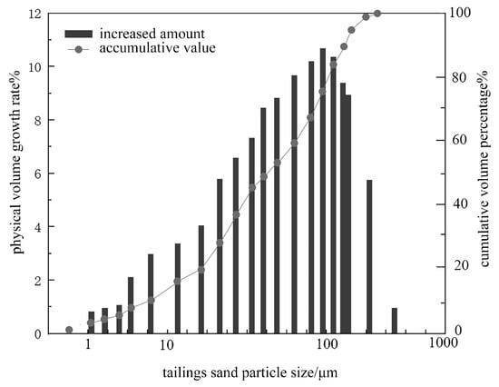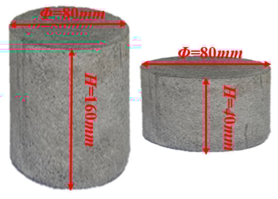 The tailings for this experiment were sourced from a copper mine in Yunnan Province [15]. The dried tailings samples underwent SA-CP3 particle size analysis, with the distribution curve displayed in Figure 1. With the increase in tailings particle size, the volume growth rate showed a trend of gradually increasing first, reaching a peak in a certain particle size range, and then decreasing. It showed that within a certain particle size range, the volume growth rate increased first with the increase in tailings particle size and then decreased after exceeding a certain particle size. The cumulative volume percentage showed a continuous upward trend with the increase in tailings particle size, and the rising rate gradually became faster, indicating that the proportion of cumulative volume to total volume increased with the increase in tailings particle size. Four groups of specimens with c/s ratios of 1:4, 1:6, 1:8, and 1:10 were prepared using 325 # ordinary Portland cement (mass concentration 72%) as cementitious material, and the water addition amount was 532 kg/m3. After the pouring was completed, the mold was opened, and the specimen was taken out after standing for 24 h. The specimen was cured in the natural state for 28 days to reach the predetermined strength. CB specimens with a diameter of 80 mm were prepared according to the experimental equipment. According to the relevant standard T/GRM 087-2023 ‘Technical Specification for Indoor Preparation and Mechanical Properties Test of Cemented Filling Body’ [16], the uniaxial compressive strength test and disc splitting tensile test were carried out with a height–diameter ratio of 2, that is, a sample height of 160 mm and 6 blocks for each c/s ratios. The uniaxial compressive strength was calculated according to the formula σ = F1/S, where F1 is the axial pressure (kN) and S is the cross-sectional area of the specimen (m2). The splitting tensile strength was calculated according to σt = 2F2/(πDH), where F2 is the axial load (kN) at the time of failure and D and H are the diameter and height (mm) of the cylinder specimen, respectively. The SHPB dynamic impact test used a specimen with a height–diameter ratio of 0.5; that is, the height of the specimen was 40 mm, and three specimens were prepared with different c/s ratios. The different sizes of CB samples are illustrated in Figure 2. The average value was calculated according to the experimental results of the three specimens, and the statistics are listed in Table 1.