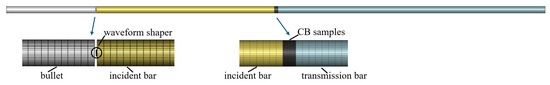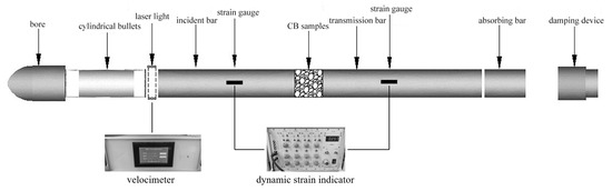 The dimensions of the simulated uniaxial impact test system were the same as those of the SHPB test apparatus at Kunming University of Science and Technology [17]. Figure 3 shows a schematic diagram of the SHPB system. The SHPB rods had a diameter of 80 mm, with the bullet, incident bar, and transmission bar lengths being 1, 2, and 3 m, respectively. All components were made of high-strength carbon steel, with a density of 7740 kg/m3, an elastic modulus of 207 GPa, a longitudinal wave velocity of 5159 m/s, and a Poisson’s ratio of 0.25. The experiment was carried out using the Chinese national standard GB/T 38565-2020. The velocity of the bullet was controlled by changing the air pressure so that the bullet hit the incident bar and generated a stress wave. The stress wave propagated in the incident bar, part of which was transmitted to the transmission bar through the specimen, and the other part was reflected in the incident bar. Using strain gauge and dynamic strain indicator, the signals of incident wave, reflected wave, and transmitted wave were collected synchronously. These signals reflected the propagation of stress waves in the compressive bar and the specimen. By analyzing the strain signals measured by the strain gauge, the stress–strain relationship of the CB at high strain rates can be obtained.