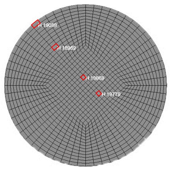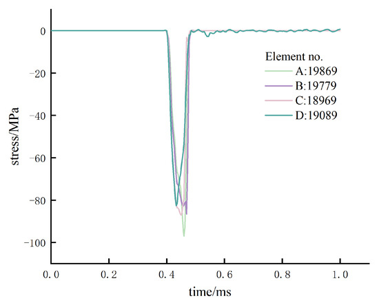 Four stress monitoring points were set along the diameter of the end surface of CB samples (Figure 6) to monitor whether the stress distribution on the end surface was uniform or not. For an applied stress of 0.165 MPa, the time-dependent stress curves of the four monitoring points are displayed in Figure 7, which indicated uniform stress across the end surface with no stress concentration points.