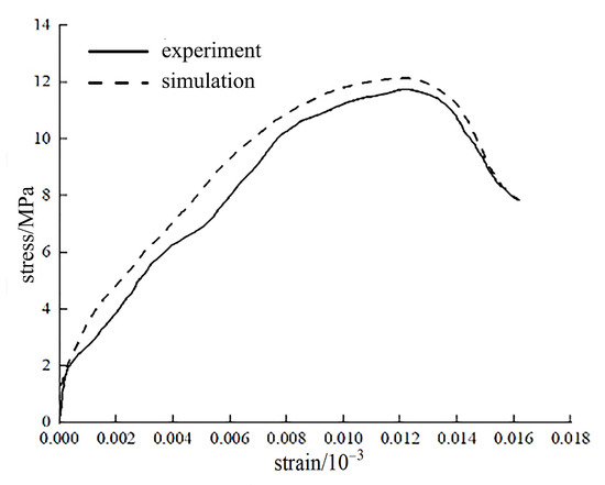To verify the numerical simulation against actual SHPB impact tests, dynamic impact experiments were conducted on CB samples with a diameter of 80 mm and length of 40 mm. Suitable samples were selected, lubricated on the end surfaces, and placed between the incident and transmission bars. The bullet’s loading velocity was measured using a laser tester. Figure 8 compares the stress–strain curves at a bullet velocity of 1.7 m/s. It was observed that the numerical curves closely matched the experimental curves, with no significant difference in peak stress, indicating appropriate selection of the HJC dynamic model parameters [23].