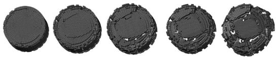 The numerical simulation results closely matched the laboratory experiments in terms of the failure mode and dynamic fracture process of the CB. The CB sample under uniaxial dynamic impact was subjected to tensile and compressive actions that cause internal primary cracks to close, so it began to undergo shear-dominated damage. The edges of the sample spalled to form a conical shape with a core retention phenomenon. The failure process of the CB sample with a c/s ratio of 1:4 and an applied stress of 0.165 MPa is illustrated in Figure 10. When the stress wave reached the end surface of the CB sample, damage first appeared on the periphery. Under high-speed compressive impact, the CB sample was deformed and reduced in length as a result of squeezing along the length direction, while the expansion occurred in its radial direction. The sample was subjected to transverse tensile stress, causing micro-cracks at the circumference edge. With the continuous increase in the transverse stress, the number of cracks increased, and they penetrated the sample. Multiple cracks of different sizes that were parallel to the length of the CB sample were formed, leading to partial spalling of the sample’s edges. As the cracks continuously increased in size and extended inwards, the external CB began to separate from the rock core, eventually resulting in a rock core surrounded by multiple fragmented pieces.