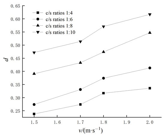 - When the v increased from 1.7 m/s to 1.8 m/s, the d rose by over 10%. As the v increased from 1.5 m/s to 2.0 m/s, the d ranges for c/s ratios of 1:4, 1:6, 1:8, and 1:10 were 0.238–0.336, 0.274–0.413, 0.391–0.547, and 0.473–0.617, respectively. A significant ‘leap’ phenomenon in damage was observed when the c/s ratio changed from 1:6 to 1:8.