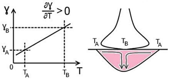 - Inverse Marangoni convection [5] occurs when a surfactant element in a weld pool favors the molten metal movement from the weld edges to the center of the weld pool, leading to a penetrated weld and narrower weld bead, as shown in Figure 1.