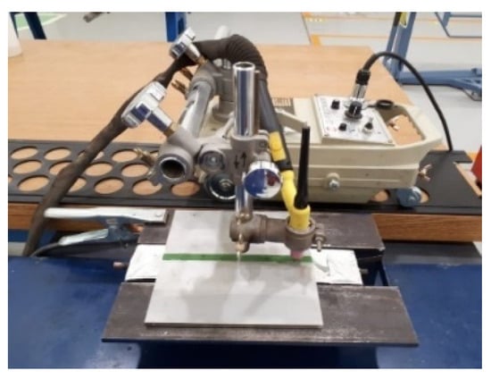 The welding machine used is the TIG from ESAB manufacturer with a motorized carriage that allows us to approach the automatic welding to make sure that the weld is performed at a constant speed and the constant length of arc welding, as shown in Figure 3. The shielding gas used is Argon.