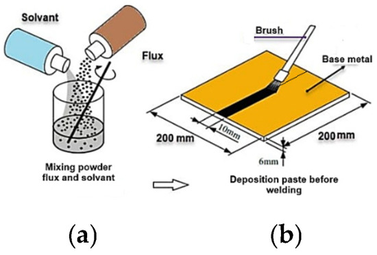 Experiments consist of welding a 20 cm line on a rectangular plate of 6 mm thickness. Before welding, the 100 mm × 200 mm × 6 mm plates were cleaned with acetone. The powders have been heated separately in a furnace at 100 °C for 1 h to eliminate humidity. Acetone (or methanol), a volatile product, is poured onto the oxide in a 1:1 ratio and gently mixed until it has a paint-like consistency, easy to spread on the edges of the plates to be welded. The thickness of the flux layer is measured using the micrometric method. This method allows for the flux layer thickness measurement with an error limit of 5 microns. In this method, the thickness of the flux layer is determined by taking at least three measurements. The supposed thickness of the paste layer was estimated to be 0.4 mm, as shown in Figure 4. The mean coating density of flux was about 4–5 mg/cm2.
