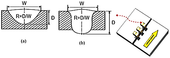 Based on Table 10 results, the numerical equations of the depth (D) and the aspect ratio (R) are provided as follows (Equations (10) and (11)).