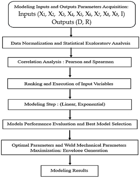 In welding processes, obtaining a weld joint of required properties is a critical issue in various domains, including the automotive industry, aerospace, construction, and manufacturing. In fact, for these domains, the weld bead geometry, mechanical properties, and distortion features should be in certain acceptable ranges to prevent any possible deterioration during the welded systems’ use. However, determining the optimal parameters for the welding process remains a significant challenge because of the complex relationships between various factors, including the thermophysical properties of the fluxes, which help in the welding process. Variables such as enthalpy of formation, melting point flux, flux surface tension, and welding current must be carefully selected to produce weld depth and the weld aspect ratio to achieve a full penetration in a single pass. In addition, the diversity of materials being welded, ranging from traditional steels to advanced alloys, may cause additional complexity as each material has its own thermal and mechanical properties, necessitating carefully calibrated welding conditions specific to each material. In this section, a systematic and comprehensive approach combining experimental analysis, mathematical modeling, computational methods, and advanced optimization techniques for accurately capturing the complex relationships between the welding process inputs and outputs will be detailed. The flowchart of the overall framework is depicted in Figure 6 below.