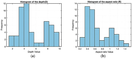 As the above models are calibrated using normalized values for either the inputs and outputs, the obtained depth (D) and aspect ratio (R) should be denormalized to their original scales according to the following Equations (12) and (13):