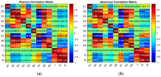 As the study is about modeling the effect of multiple inputs (X1, X2, X3, X4, X5, X6, X7, X8, X9, and I) on two outputs (D and R) considered separately, it is crucial to select the most significant inputs to prevent unnecessary complexity of the models. For this aim, the most relevant inputs are selected according to three complementary criteria. Namely, the correlation (Pearson and Spearman), the user expertise, and any additional constraints. First, the input variables are selected based on their correlation coefficients with the two outputs. The two correlation matrices were calculated, and they are depicted in Figure 8 below. It can be noticed from the matrices that X2, X3, X4, X7, X9, and I are the most correlated (in absolute value) with the outputs (D and R). Additionally, as per the user’s expertise, the other variables were excluded because they may have the same effect as one of the selected inputs. For example, X1 is highly correlated with X3 (0.85 Spearman correlation), and X5 is well correlated with X2 and X3 (respectively, 0.77 and 0.56 in Spearman). In addition, X8 was excluded because of its high correlation with X2 and X3. The process of exclusion is typically adopted to prevent redundancy and unnecessary model complexity, which may induce additional computational burden. In addition, the three input variables—X5 (surface tension flux), X6 (ionization potential), and X8 (boiling point of flux—Melting point of base metal)—were excluded based on domain expertise. The decision was driven by several considerations. First, X5 (oxide surface tension) is inherently difficult to quantify consistently, as surface tension effects depend on dynamic weld pool conditions that vary during arc operation and may not be accurately captured by a static material property. Similarly, X6 (ionization potential), while relevant in arc physics, tends to have a secondary influence on bead geometry compared to more dominant parameters such as thermal conductivity or oxide layer behavior. Its effect is typically indirect and moderated by the shielding gas and arc current settings, which remained constant in this study. Finally, X8, representing the difference between the boiling point of the flux and the melting point of the base metal, showed limited variation across the tested oxides and was found to contribute minimally to prediction accuracy in preliminary trials. Through this domain expertise approach, a certain level of trade-off between the model accuracy and complexity is ensured. It is worth noting also that the welding current (I) is the most influential input as it has higher correlations with both the depth (D) and the aspect ratio (R). The Pearson correlation (D, I) and (R, I) are, respectively, 0.73 and 0.57, and the Spearman correlation is 0.72 and 0.48. Although the Pearson correlation has exhibited high values for the selected inputs with the outputs, the Spearman correlation has also shown nonlinear relationships, which may stipulate a high competitiveness between linear and nonlinear models. In what follows, we will detail the progressive steps of implementing two different types of models, namely, linear and exponential, as described in Equations (2) and (3).