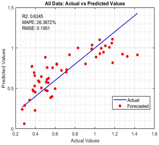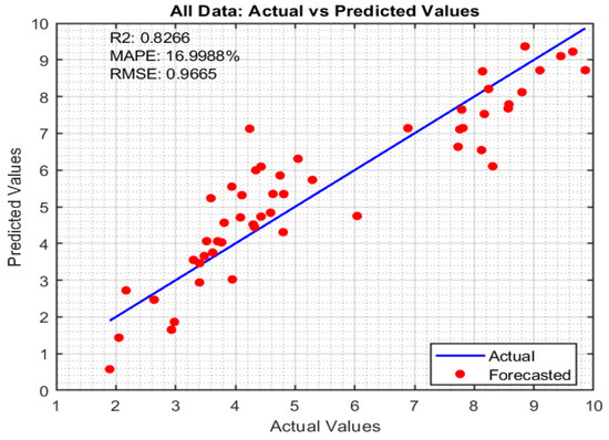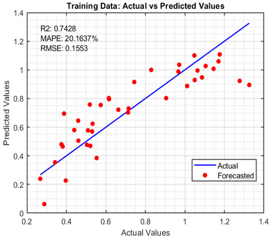 The phenomenon in ATIG welding is very complex. However, as the manuscript states, the two mechanisms are responsible for increasing depth penetration at the expense of the weld width. Experiments conclude that the depth of penetration is affected by the amount of oxygen content during welding, as it favors the influence of inverse Marangoni convection and the arc constriction. Increasing current intensity increases the heat supplied to the workpiece; it allows the release of oxygen, which will play its role as a surfactant element. The thermal properties, such as the oxide’s enthalpy energy and the oxide’s melting point, are crucial for the amount of oxygen liberated. For instance, the oxides that have a melting temperature close to that of the workpiece to be welded significantly affect the shape and the morphology of the weld bead. Oxides with a surface tension greater than 500 mN/m poorly wet the weld pool metal, which contributes to a decrease in the width of the bead and have insufficient effective participation in the weld pool metal melt. Oxides with a surface tension below 260 mN/m are characterized by low melting and boiling temperatures, decompose during welding, and saturate the welding arc with gaseous products of the oxide flux (oxygen anions and metal cations). This contributes to some reduction in the effectiveness of the action of oxide fluxes on the morphology of welded seams and the occurrence of mechanisms of action of fluxes associated with physical processes occurring in the welding arc. Owing to the complexity of the phenomena that occurred during a welding operation, we remark a slight variability in the aspect ratio results. This is observable when the whole dataset is used (52 samples). Based on the obtained results, the nonlinear exponential model will be adopted in what follows, and further analysis based on that model will be performed. The scatter plots of the depth (D) modeling are provided in Figure 9, Figure 10 and Figure 11 for the training, validation, and all datasets.
