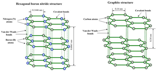 Structures of h-BN (left) and graphite (right). Reproduced from www.substech.com [25].