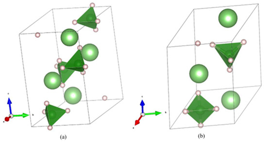 (Color online). (a) The room temperature, orthorhombic-LiBH4 (o-LiBH4), transforms into (b) hexagonal-LiBH4 (h-LiBH4) at ∼388 K). At ambient pressures, the o- and h-LiBH4 exist in space groups Pnma and P63mc. Li = green, hydrogen = whitish, boron = inside green tetrahedral [89].