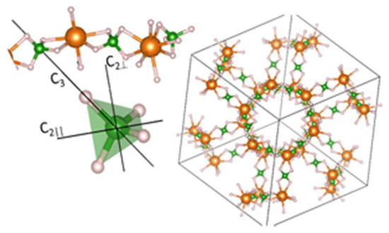 The left image shows three [BH4] tetrahedra in their respective Mg setting and a magnification of one tetrahedra with its rotational axes. C3 is the 3-fold 120° axis, and and are the 2-fold 180° axis. The right image shows the crystal structure of γ-Mg(BH4)2 with one interpenetrating channel. Spheres in orange: Mg-, green: B-, and grey: H-atoms [89].
