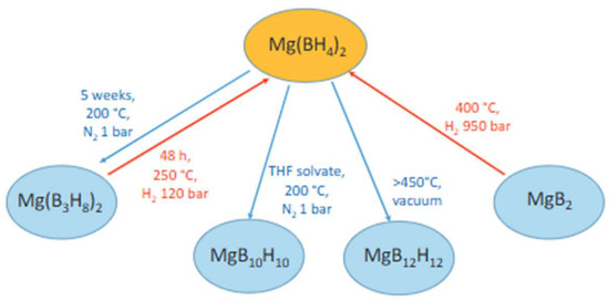 Selected hydrogenation (in red) and dehydrogenation (in blue) reactions with Mg(BH4)2 [92].