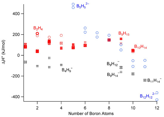 Experimental (bold) and theoretical formation enthalpy values for neutral (red), monoanionic (black), and dianionic (blue) species. Closo species, circles; nido, #; arachno, crossed squares. Data from [97,98,99,100,101,102]. For closo ions BnHn2−, data (blue circles) from two different studies reveal systematic differences. All monoanionic species (in black) have negative formation enthalpies, while all neutral boranes (in red) have positive formation enthalpies [96].