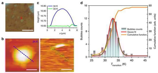 Figure 6a presents an optical image of bubbles on an h-BN flake. After transferring the sample into a vacuum chamber equipped with AFM, it was gradually cooled. Topographic AFM images of the same region at 34 K and 33 K are shown in Figure 6b. It is evident that the bubbles are inflated with gas at 34 K but collapse at 33 K. As illustrated in Figure 6c, height profiles taken along the dashed lines in Figure 6b demonstrate that the bubble is visible at 34 K but disappears at 33 K.