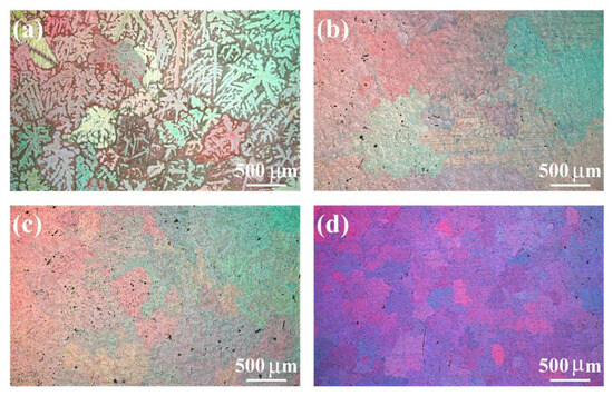 Microstructure of the as-homogenized alloys: (a) T3, (b) TX31, (c) TXZ311, and (d) TXK311.