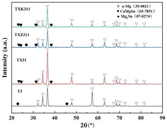 The XRD patterns of as-homogenized T3, TX31, TXZ311, and TXK311 alloys are shown in Figure 3. The XRD pattern of the T3 alloy sample contains α-Mg and Mg2Sn phases. After the addition of 1 wt.% Ca, the diffraction peaks of a-Mg and CaMgSn phases can be observed in the alloy’s XRD pattern. The composition of this phase is in line with the findings of Reference [15]. At a Sn/Ca mass ratio of approximately 3, nearly all of the Ca combines with Sn to form CaMgSn particles, while the remaining Sn dissolves in the Mg matrix. With the addition of Zn and Zr elements, the Sn/Ca mass ratio of the TXZ311 and TXK311 alloys is about 3.1. In these alloys, the peak intensity of Mg2Sn disappears, and the diffraction peaks belonging to the CaMgSn phase emerge, with no other new peaks detected. In the TXZ311 and TXK311 alloys, no diffraction peaks containing Zn and Zr elements were found. This could be because the added Zn and Zr elements dissolved in the Mg matrix and did not form a new phase with Mg and Sn elements. It may also be attributed to the low content of Zn and Zr, which was below the detection limit.