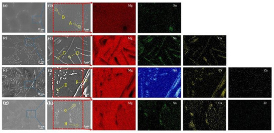 SEM micrographs of the as-homogenized alloys and corresponding EDS elemental mapping results: (a,b) T3, (c,d) TX31, (e,f) TXZ311, and (g,h) TXK311.