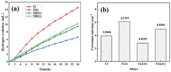 Figure 5 displays the amount of hydrogen evolution and the hydrogen-evolution corrosion rate of the four as-homogenized alloys when corroded in a 3.5% NaCl solution for 24 h. For the T3 and TXK311 alloys, the amount of hydrogen released increased approximately linearly with corrosion time. This indicates that the amount of hydrogen released was nearly equal every 2 h, suggesting that no protective film formed on the surfaces of these alloys or that the oxide film formed did not offer a protective function during the corrosion process. For the TX31 alloy, the amount of hydrogen released increased slightly after 2 h, then the release rate slowed down, and it increased linearly again after 12 h. The hydrogen-evolution rate of the TXZ311 alloy exhibited a similar decreasing trend as the immersion time increased, which might be attributed to the protective effect of the oxide film formed on its surface. Moreover, the corrosion rate of the studied alloys increased with the addition of Ca elements as the corrosion time extended. However, with the further addition of Zn and Zr elements, the corrosion rate decreased to varying degrees. As presented in Figure 5b, the TX31 alloy had the highest hydrogen-evolution rate of 6.14 mm·year−1, indicating the worst corrosion resistance, while the TXZ311 alloy had the lowest hydrogen-evolution rate of 2.82 mm·year−1, demonstrating the best corrosion resistance.