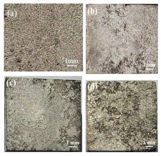 Macro-morphology of corroded surface of alloy after 24 h immersion. (a) T3, (b) TX31, (c) TXZ311, and (d) TXK311.