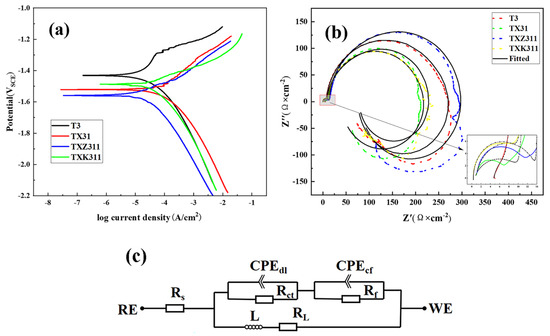 Figure 8 shows the polarization curves and Nyquist diagrams of the as-homogenized T3, TX31, TXZ311, and TXK311 alloys. In general, the cathodic polarization curve represents the hydrogen-evolution reaction, and the anode branch represents the dissolution reaction of the Mg matrix. From the anodic part of the polarization curves in Figure 8a, it can be observed that the passivation of the T3 alloy was more pronounced. In contrast, there was no obvious passivation stage in the alloy with Ca addition. This indicates that the microstructure after Ca addition has little impact on the mechanism of forming anodic branches and that the oxide film on the surface of these alloys provides incomplete protection.