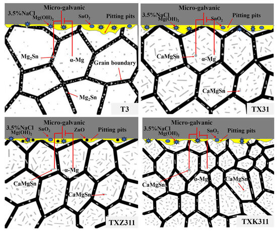 The corrosion mechanism of as-homogenized T3, TXZ311, and TXK311 alloys is shown in Figure 9. The dark gray color represents the 3.5% NaCl solution, the white color represents the matrix α-Mg, the black color represents grain boundaries, the gray color represents the second phase distributed at grain boundaries, the black dots represent ZnO, the far blue point represents SnO2, and the sun-shape pattern represents Mg(OH)2. The corrosion of the four Mg alloys in a sodium chloride solution is a complex process of galvanic coupling corrosion and chemical corrosion together. The specific mechanism is as follows: