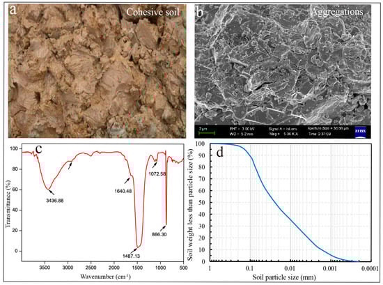 The morphological characteristics of cohesive soil are shown in Figure 1a,b. Soil color is usually dominated by brown and gray. Cohesive soil often develops slip surfaces along water-rich layers or bedrock contacts, with creep-slip marks or microcracks visible on the surface. These spherical particles can also be aggregated into clusters to form larger aggregates with a diameter of 200 μm. As shown in Figure 1c, the cohesive soil was analyzed by FTIR from the range of 4000–500 cm−1. The spectra exhibited an absorption peak at 1072.58 cm−1 which originated from the V1 mode (the symmetric stretch in the non-centrosymmetric structure). The next absorption band at 866.30 cm−1 may be due to the V2 mode (carbonate out-of-plane bending) and the absorption band at 1487.13 cm−1 might be due to the V3 mode (the asymmetric stretch) []. The characteristic absorption peak corresponding to V4 mode (mainly associated with functional groups such as carbonyls, carboxylic acids, and esters) seemed to emerge in 500–1000 cm−1. Furthermore, the absorption peak at 1640.48 cm−1 as well as 3436.88 cm−1 may be derived from C=C double bond stretching vibrations and hydroxyl (-OH) stretching vibrations [].