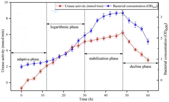 The components of the liquid culture medium were beef extract (5 g/L), tryptone (10 g/L), and NaCl (5 g/L). The pH value was adjusted to 7.0–7.2 by NaOH and HCl solutions. The results of bacterial concentration (OD600) and urease activity are shown in Figure 2. The growth process of bacteria consisted of four phases, which were adaptive phase, logarithmic phase, stabilization phase, and decline phase. The bacterial concentration reached its maximum value at 48 h, which corresponded to a peak urease activity with 6.72 mmol/min. After 48 h, there was a decrease in the bacterial concentration due to the depletion of nutrients in the culture medium. Therefore, bacteria cultured for 48 h were selected to induce calcium carbonate precipitation.