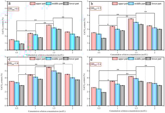 Calcium carbonate content of specimens in relation to the concentration of cementation solution and bacterial solution. (a), the OD600 value of the BS was 0.6; (b), the OD600 value of the BS was 1.2; (c), the OD600 value of the BS was 1.8; (d), the OD600 value of the BS was 2.4. Asterisks (*, **) mean p < 0.01, indicating the results have statistical significance.