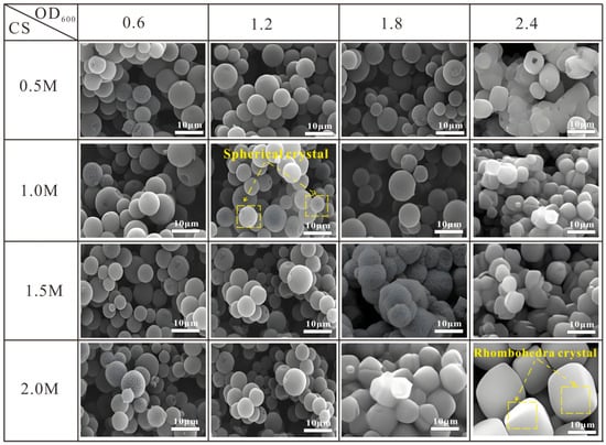 A higher BS concentration of microorganisms secreted more urease, which accelerated the hydrolysis of urea to NH4+ and CO32−, significantly increasing the local pH value [,]. Alkaline environments (pH > 8.5) were more favorable for the formation of thermodynamically stable rhombohedral crystal than sub-stable spherical crystal. In addition, the ability of negatively charged functional groups on the microbial cell surface to adsorb Ca2+ increased with increasing concentration, resulting in the formation of more evenly distributed nucleation sites. The dense nucleation sites induced the directional growth of crystals along specific crystal faces and inhibited the random accumulation of spherical crystals [].