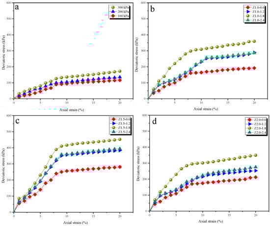 As shown in Figure 5, the strength of calcium carbonate and the reinforcing effect of MICP can be reflected by the mechanical characteristics of the cohesive soil. The stress–strain curves of the unreinforced soil samples were generally of hardening type [,]. Specifically, deviatoric stress rose with the increase in axial strain, roughly linearly (initial yielding stage), and then the increasing trend gradually slowed down, and its strain hardening modulus was relatively small (stress strengthening stage). At the same time, the stress–strain curve shifted upward with the increase in the confining pressure, ranging from 100 kPa to 300 kPa (Figure 5a).