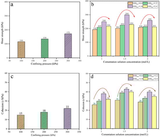 In addition, the relationships between other mechanical characteristics, including shear strength, cohesion, and internal friction angle, and CS-BS concentrations are shown in Figure 6. The shear strength of the cohesive soil before MICP treatment was 115 kPa, 135 kPa, and 172 kPa under the confining pressures of 100 kPa, 200 kPa, and 300 kPa, respectively (Figure 6a). The variation patterns under different confining pressures were the same. Taking a confining pressure of 300 kPa as an example, for 1.0 M CS concentration, the shear strength was 192 kPa, 209 kPa, 249 kPa, and 216 kPa corresponding to the different BS concentrations (OD600 = 0.6, 1.2, 1.8 and 2.4). For 1.5 M and 2.0 M CS concentration, the shear strength ranged from 201 to 299 kPa and 208 to 259 kPa, respectively (Figure 6b), indicating that the shear strength of soil samples after MICP treatment was significantly higher than that of soil samples before MICP treatment. In addition, at the same CS concentration, the shear strength showed a trend of first increasing and then decreasing with the increase in the BS concentration. At the same BS concentration, as the concentration of bacterial solution increased, the shear strength also showed a trend of first increasing and then decreasing with the increase in the CS concentration, reaching its maximum value with optimal combination (CS = 1.5 M and OD600 = 1.8). After MICP reinforcement, the shear strength of the cohesive soil increased by 11.6%~73.8%, with the least and most increased combinations being Z 1.0–0.6 and Z 1.5–1.8, respectively.