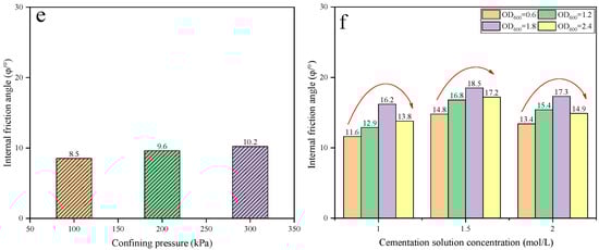 Mechanical characteristics of the cohesive soil: (a), the shear strength of the unreinforced soil samples with the increase in the confining pressure from 100 kPa to 300 kPa; (b), the shear strength of the soil samples after reinforcement by MICP at a confining pressure of 300 kPa; (c), the cohesion of the unreinforced soil samples with the increase in the confining pressure from 100 kPa to 300 kPa; (d), the cohesion of the soil samples after reinforcement by MICP at a confining pressure of 300 kPa; (e), the internal friction angle of the unreinforced soil samples with an increase in the confining pressure from 100 kPa to 300 kPa; (f), the internal friction angle of the soil samples after reinforcement by MICP at a confining pressure of 300 kPa. Red arrows indicate an increasing or decreasing trend.