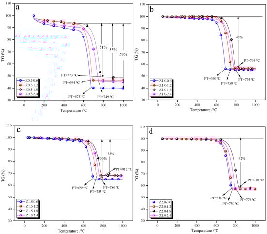 TG images of cohesive soil at different BS and CS concentrations. (a), 0.5 M CS concentration at different BS concentrations; (b), 1.0 M CS concentration at different BS concentrations; (c), 1.5 M CS concentration at different BS concentrations; (d), 2.0 M CS concentration at different BS concentrations.