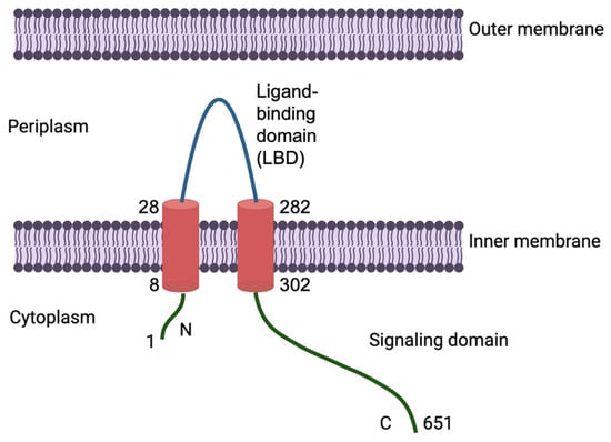 Chemotaxis is a complex signalling system present in many bacteria. It facilitates stimuli-directed movement, playing a key role in host colonisation and invasion by bacteria []. Flagellar-driven motility can be guided by external gradients of chemoattractants or chemorepellents [,]. These molecules are recognised by the ligand-binding domains of methyl-accepting chemotaxis protein (MCP) receptors, also known as transducer-like proteins (Tlps). Upon signal detection, chemoreceptors activate intracellular signalling cascades via their cytoplasmic signalling domains, which controls the behaviour of the flagellar motors. This enables bacteria to navigate towards favourable environments and away from harmful conditions, thereby promoting survival [,,,].