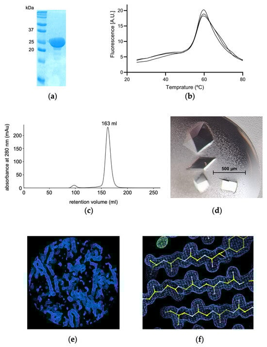 - Matthews, B.W. Solvent content of protein crystals. J. Mol. Biol. 1968, 33, 491–497. [Google Scholar] [CrossRef]