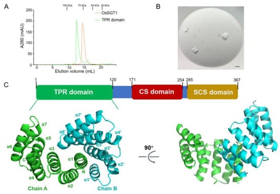 The crystal structural characterization of the OsSGT1-TPR protein. (A) Size-exclusion chromatographic analysis revealed that both full-length OsSGT1 and its TPR domain form stable dimers in solution, as evidenced by elution volumes corresponding to their theoretical dimeric molecular weights. (B) Representative crystals of the recombinant OsSGT1-TPR domain were obtained under optimized crystallization conditions. The scale bar is 0.1 mm. (C) Schematic representations of OsSGT1 (up panel) and the dimeric TPR domain structure (lower panel), indicating conserved domains: the TPR, SGS, and CS domain in the classical architecture of OsSGT1. The overall structure of the TPR domain was shown in cartoon representations (90° rotation view). The overall dimeric structure of the TPR domain in the ribbon diagram presented two orthogonal views (0° and 90° rotation), with secondary structural elements clearly resolved.