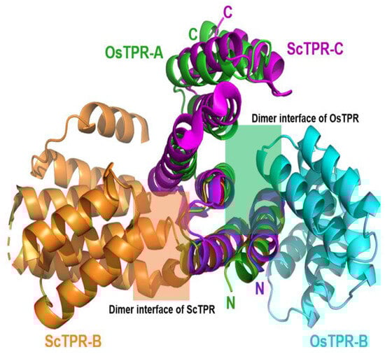 A comparative analysis of dimer interfaces in OsTPR and yeast ScTPR. The dimer interface of OsTPR (highlighted in green and blue) was demarcated by a green box, whereas the corresponding interface in ScTPR was enclosed in an orange box. This visual distinction emphasizes structural divergences between the two orthologs.