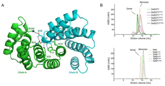 The details of the OsTPR dimer interface. (A) Structural details of key residues mediating OsTPR dimer stabilization. Key hydrogen bonds and hydrophobic interactions are highlighted with dashed lines. (B) Size-exclusion chromatography profiles in vitro comparing the oligomerization states of wild-type and interface-disrupting mutants (the TPR domain and full-length OsSGT1), as evidenced by elution volumes corresponding to their theoretical molecular weights.