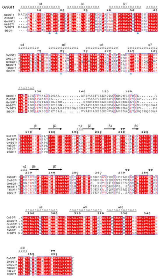 The evolutionary conservation of SGT1 orthologs across plant species. The multiple sequence alignment of SGT1 proteins from six species: Oryza sativa OsSGT1 (AAF18438.1), Zea mays ZmSGT1 (AKD95366.1), Glycine max GmSGT1-1 (ACI31549.1), Nicotiana benthamiana NbSGT1 (AAW82048.1), Triticum aestivum TaSGT1 (ABQ23992.1), and Solanum tuberosum StSGT1 (AAU04979.1). Secondary structure elements (α-helices depicted as coils and β-strands as arrows) are labeled above the alignment. Residues critical for SGT1 dimerization are marked with blue triangles. Sequence alignment was performed using MEGA (version 4.21.4), with secondary structure predictions and visual annotations generated by ESPript 3.0.