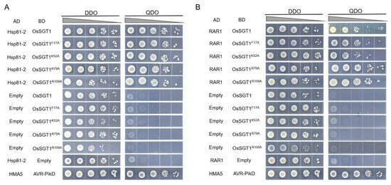 The yeast two-hybrid (Y2H) validation of OsSGT1 interactions with Hsp81-2 or RAR1. (A) Interaction analysis of OsSGT1 with Hsp81-2. (B) Interaction analysis of OsSGT1 with RAR1. Different combinations were co-transformed in the yeast AH109 strain, and transformants were selected on the double dropout medium (DDO; SD/-Leu/-Trp). Protein–protein interactions were assessed via plating onto a quadruple dropout medium (QDO; SD/-Leu/-Trp/-His/-Ade). Each test was repeated in triplicate, using independent biological replicates.