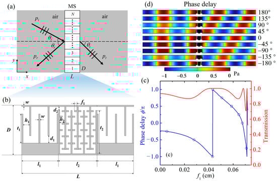 The geometric configuration of a single unit cell is detailed in Figure 1b. The unit cell spans a total length, L, composed of a central phase modulation region of length, l2, and two symmetric impedance-matching sections on either side, each of length l1. The height of the structure is represented by D. The central region contains a periodic array of vertical teeth with a tunable length, f1, which governs the effective acoustic path and thereby induces the desired phase shift in the transmitted wave. Additional geometric parameters include the tooth width, w, tooth heights, t1 and t2, groove depths, d1 and d2, and channel widths, h1 and h2, all contributing to acoustic impedance characteristics and wave propagation behavior.