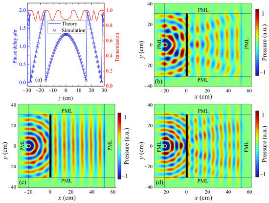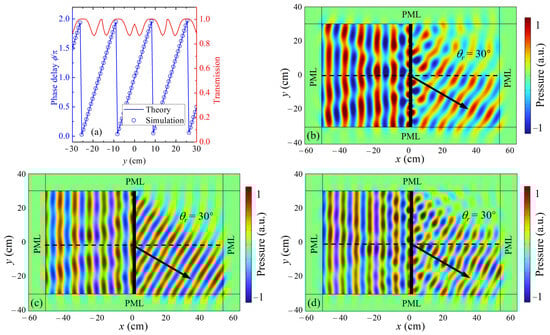 (a) Theoretical phase delay distribution (blue solid line) and simulated results (blue circles) of 81 discretized metasurface units along the transverse direction y, designed for anomalous refraction at an angle of θr = 30°. The corresponding transmission coefficients are shown in red: (b–d) simulated steady-state pressure field distributions at the following different frequencies; (b) 3600 Hz, (c) 4000 Hz, and (d) 4400 Hz. In all cases, the metasurface produces a clear anomalous refraction of the normally incident plane wave, deflecting the transmitted wavefront at the designed angle of θr = 30°. The results confirm the metasurface’s stable and broadband beam-steering performance across a moderate frequency range. Black dashed and solid lines denote the central axis and the metasurface location, respectively. All outer boundaries are treated with perfectly matched layers (PMLs) to suppress artificial reflections.