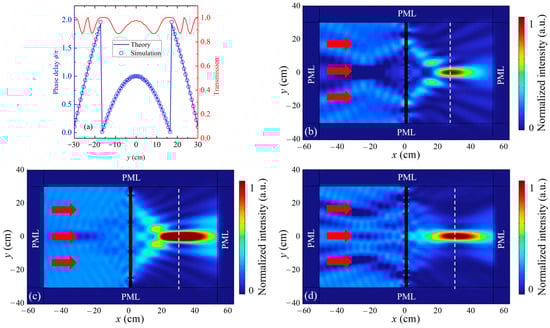 (a) Theoretical hyperbolic phase distribution (blue line) and simulated phase delays (blue circles) of discrete metasurface units for focusing at a depth of 30 cm. The corresponding transmission coefficients are plotted in red. (b–d) Simulated normalized intensity distributions at (b) 3600 Hz, (c) 4000 Hz, and (d) 4400 Hz. In each case, the planar metasurface lens focuses incident plane waves into a tight focal spot aligned with the target depth (white dashed line). The consistent focal positioning across frequencies confirms the metasurface’s broadband focusing capability. Red arrows indicate the direction of the incident wavefronts, and PML boundaries are applied to suppress reflections.