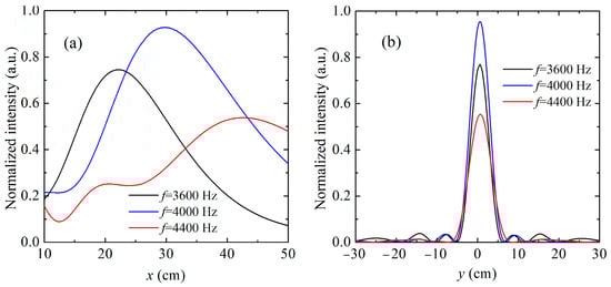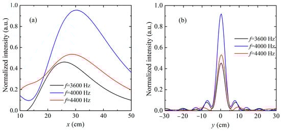 To quantitatively assess the focusing performance under varying frequencies, the normalized acoustic intensity distributions were extracted along the axial (x) and transverse (y) directions at the focal region, as shown in Figure 7. In Figure 7a, the axial intensity profiles reveal that the peak focal positions shift with frequency, as follows: at 4000 Hz, the intensity peak occurs near the target focal length of 30 cm, while at 3600 Hz and 4400 Hz, the focal spots are displaced forward and backward, respectively. These deviations reflect the frequency-dependent nature of the phase accumulation and its influence on wavefront convergence. Figure 7b displays the corresponding lateral intensity distributions. At a design frequency of 4000 Hz, the transverse profile exhibits a sharp and narrow main lobe, indicating high spatial resolution and effective acoustic confinement. Although the 3600 Hz and 4400 Hz cases also produce focused spots, their broader main lobes and elevated side lobes suggest a slight reduction in lateral resolution and energy localization at off-design frequencies. These observations confirm that the proposed metasurface maintains strong cylindrical wave focusing performance across a moderate frequency band. The frequency-induced variations in focal position and sharpness remain limited, demonstrating the design’s robustness for applications requiring reliable near-field focusing from non-planar wave sources.