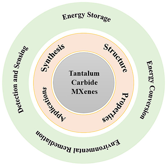 Brief description of tantalum carbide MXenes in various applications (pink area: the content of this review, green area: the application domain of tantalum carbide MXenes).