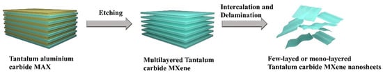 The production of tantalum carbide MXenes is mainly achieved through a top-down etching process that has evolved from conventional HF-etching methods towards more eco-friendly alternatives. Fluorine-free synthesis methods, including KOH and HCl etching, have emerged as viable alternatives, addressing safety challenges and environmental concerns simultaneously. The employment of advanced exfoliation techniques involving intercalants like TMAOH, TPAOH, and TBAOH has facilitated the synthesis of few-layer and monolayer tantalum carbide MXenes with enlarged interlayer spacing, thereby considerably improving their functional properties.