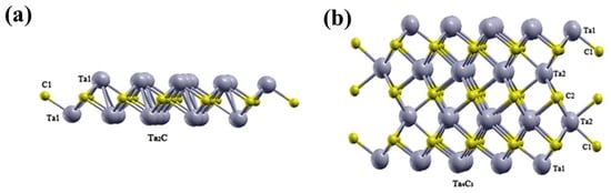 The atomic structure of pristine (a) Ta2C and (b) Ta4C3 Mxene. Permission granted for reproduction []. Copyright (2018), Wiley-VCH.
